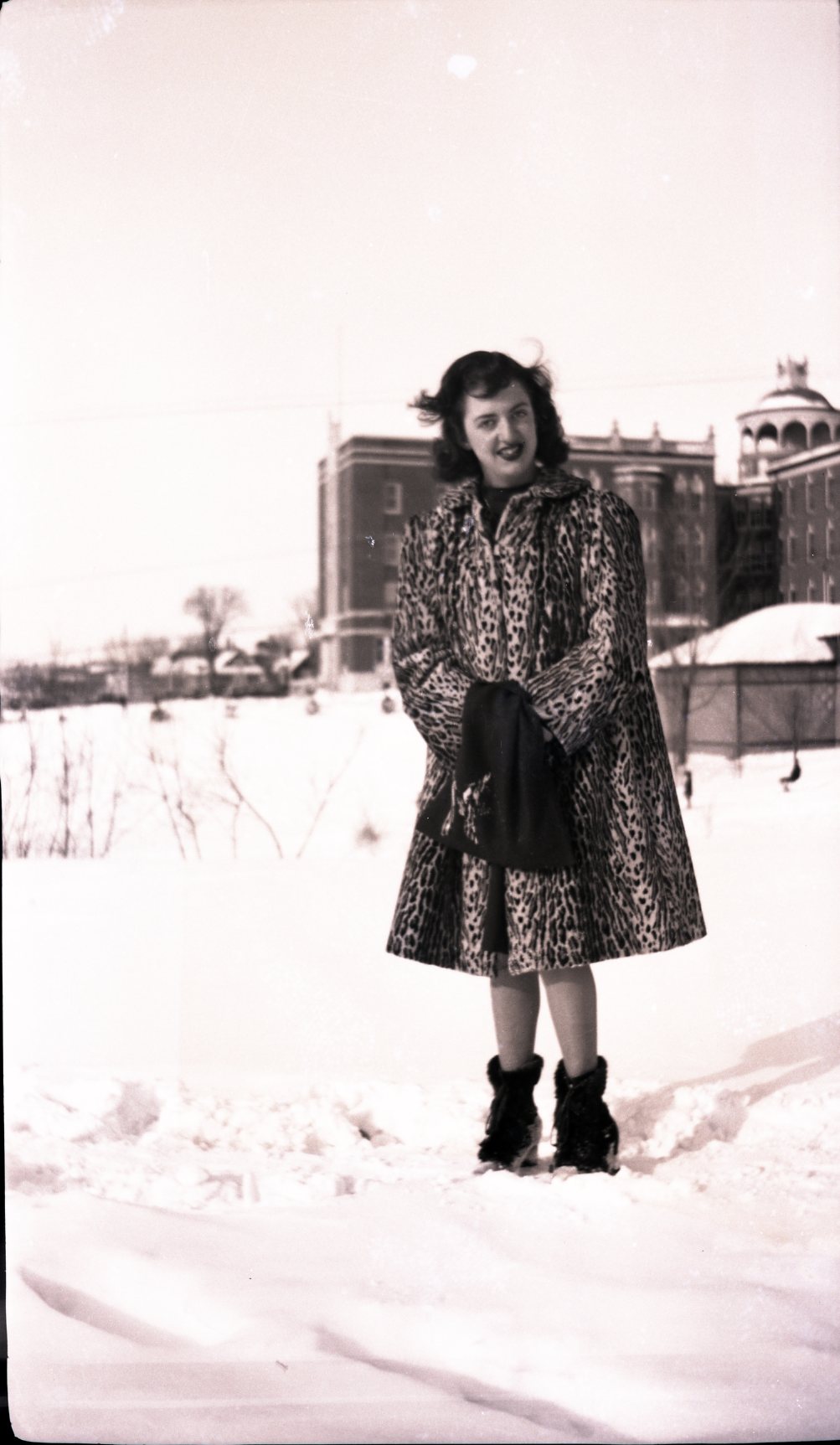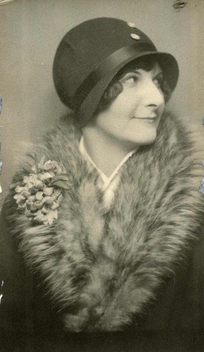 Irène Lacharité avec manteau rehaussé de fourrure blanche, 1936.