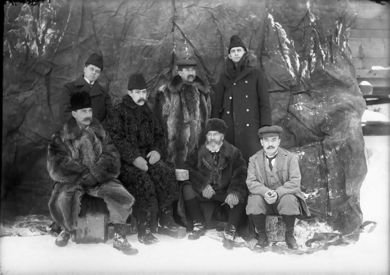 Sept hommes profitent de l'hiver, vêtus de manteaux et de
