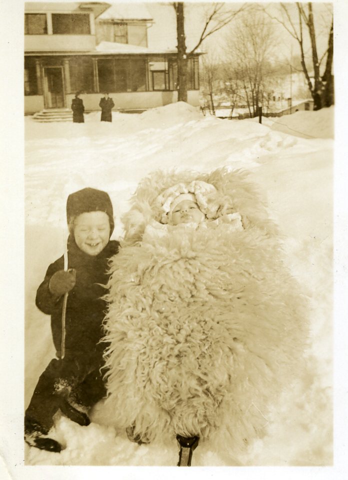 Pierre Lippé et sa petite soeur Francine Lippé couchée et emmaillotée dans une peau de mouton sur un traîneau, 1943. Archives nationales à Sherbrooke, fonds Famille Lippé (P39, S7, SS3, D4). Photographe non identifié.