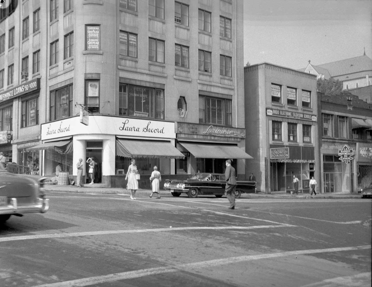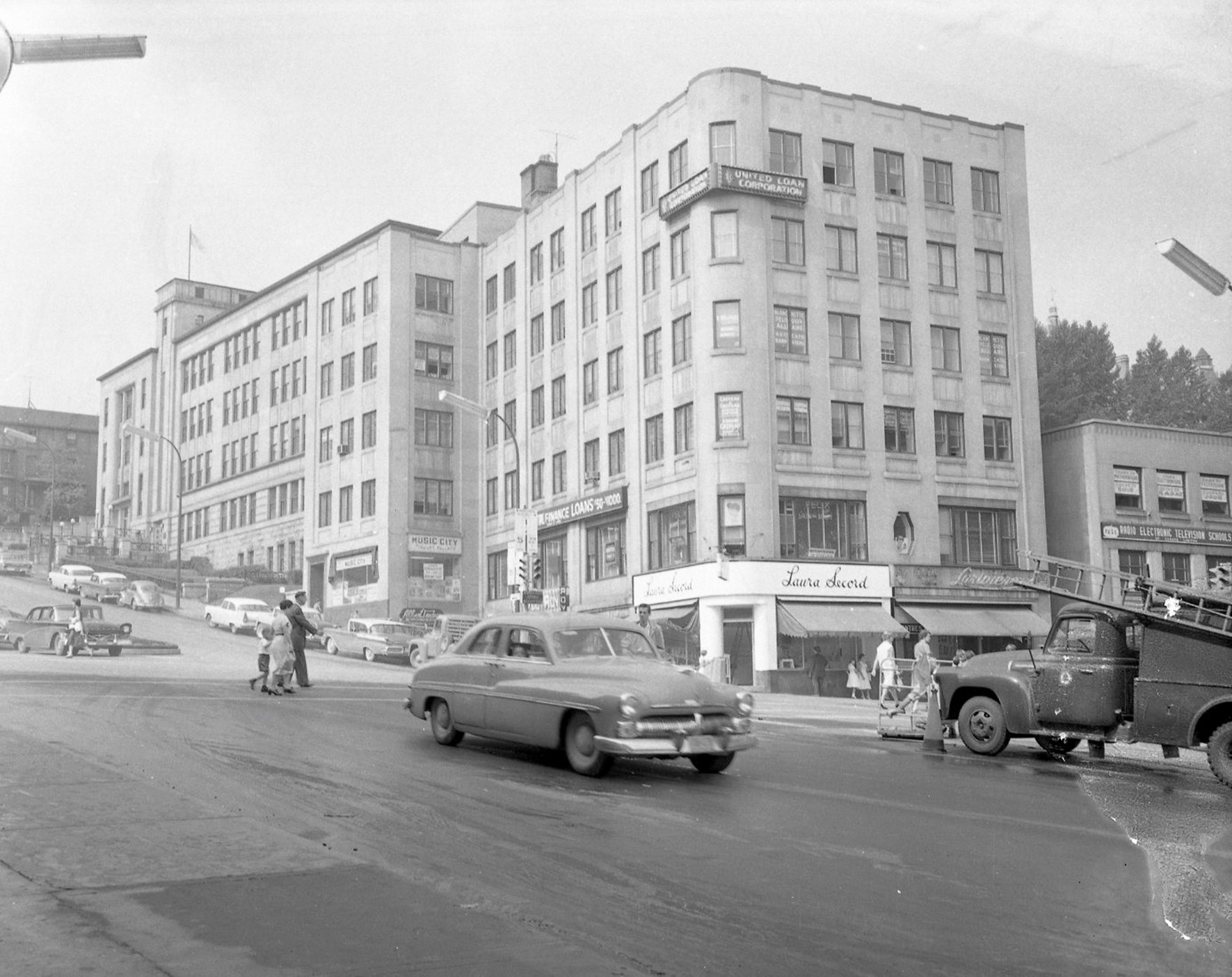 Wellington à Sherbrooke, 10 ans après l'incendie de l'Hôtel Continental, 1953.